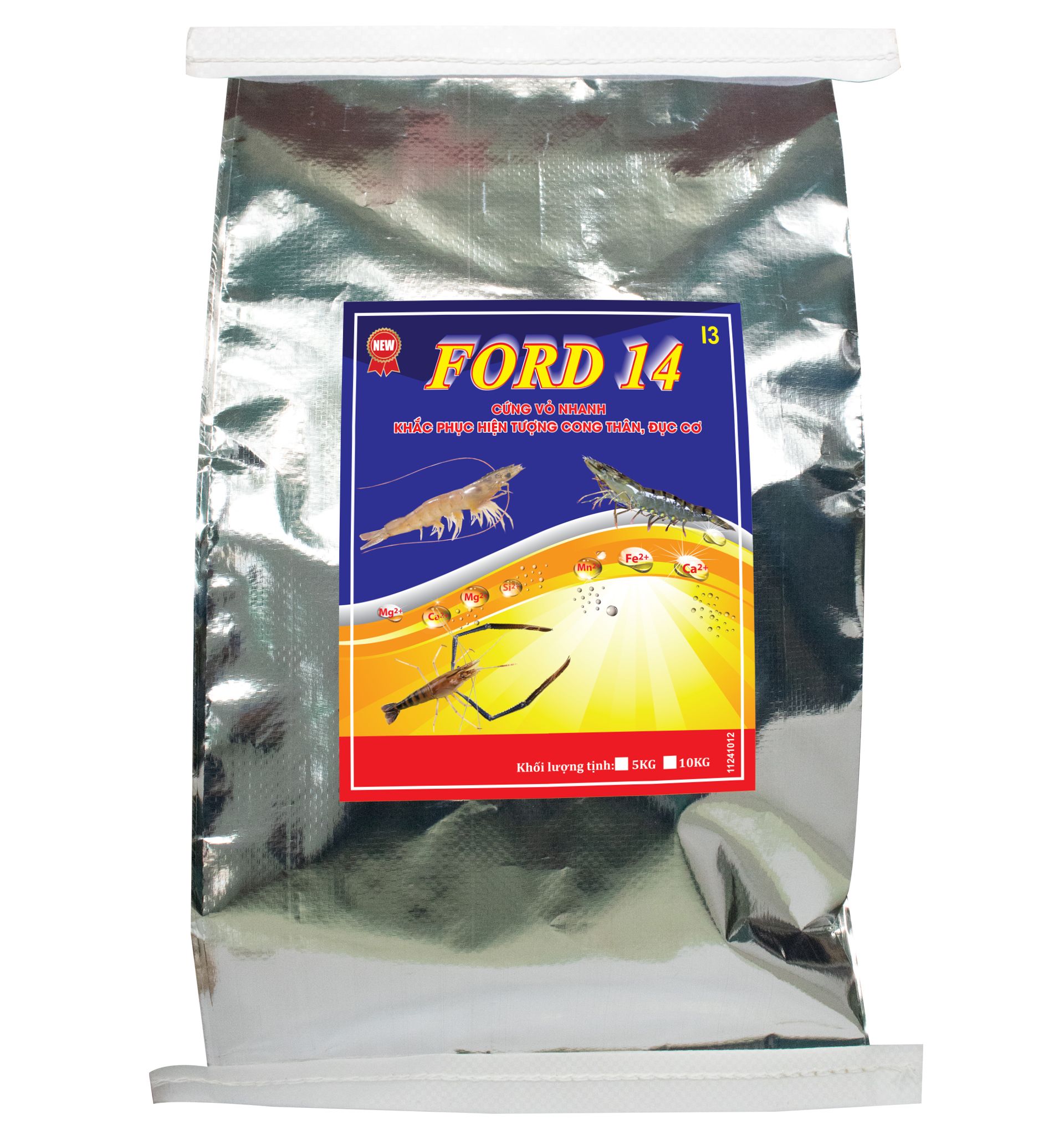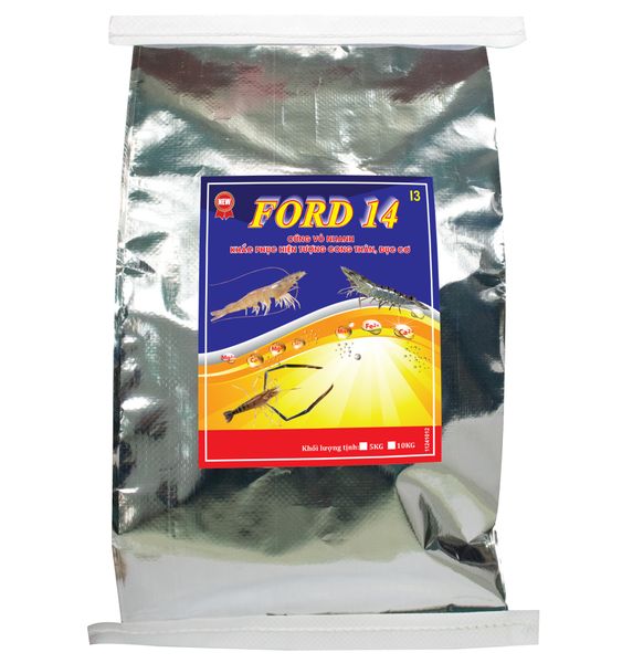 - Khoáng FORD 14 với thành phần khoáng đa vi lượng bao gồm Mg (dạng MgCl2) và Ca (dạng CaHPO4) giúp tôm cứng vỏ nhanh và khắc phục hiện tượng cong thân, đục cơ. Canxi là thành phần chính của cấu trúc vỏ tôm. Nó kết hợp với các protein và chất khoáng khác để tạo thành một mạng lưới chắc chắn, đồng thời hỗ trợ cho sự phát triển và duy trì một vỏ mạnh mẽ, tăng cường độ cứng và bền của vỏ, tái tạo vỏ mới và tái tạo lại vùng vỏ bị tổn thương bong tróc, tăng khả năng lột xác và phát triển của tôm, hỗ trợ quá trình kết tủa muối canxi, góp phần vào việc hình thành cấu trúc vỏ chắc chắn và cung cấp năng lượng cho tôm. Khi đó, Mg tác động lên quá trình hòa tan canxi và giúp tăng sự hấp thụ canxi vào vỏ tôm. Magie có khả năng giữ nước cho vỏ tôm, giúp duy trì môi trường thuận lợi để tôm phát triển và lột xác. Ngoài ra, Magie còn tham gia vào quá trình tổng hợp chất cung cấp năng lượng cho lớp vỏ mới, ảnh hưởng đến mô nối giữa lớp vỏ mới và lớp vỏ cũ và hỗ trợ quá trình loại bỏ lớp vỏ cũ, chống lại tác động tiêu cực từ môi trường, ức chế sự hủy hoại vỏ tôm từ các tác nhân như acid và muối. Canxi và Magnesium đóng vai trò quan trọng trong quá trình co bắp và truyền dẫn xung lượng điện trong cơ bắp, giúp giữ gìn và duy trì hệ xương của tôm, giúp ngăn chặn hiện tượng cong thân, đục cơ trên tôm.