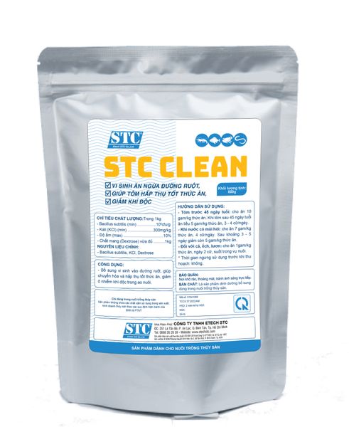 Men vi sinh tiêu hóa STC CLEAN gồm enzym amylase giúp phân hủy tinh bột, tăng cường hiệu quả hấp thụ dinh dưỡng, giúp tiêu hóa tốt hơn, tăng trưởng nhanh hơn, ức chế vi khuẩn có hại, cải thiện tỷ lệ sống cho tôm, cá, ếch, lươn.